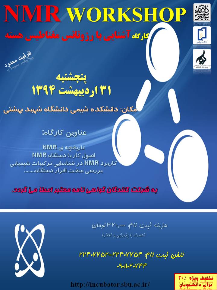- کارگاه آشنایی با رزونانس مغناطیس هسته (NMR WORKSHOP) در تاریخ پنجشنبه 31 اردیبهشت 1394 در دانشکده شیمی برگزار میشود.