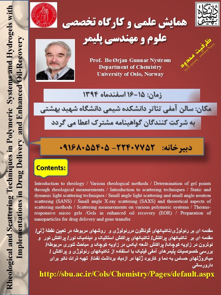 - کارگاه علوم و مهندسی پلیمر با حضور پروفسور Bo Nystrom از دانشگاه اسلو نروژ برگزار میشود.