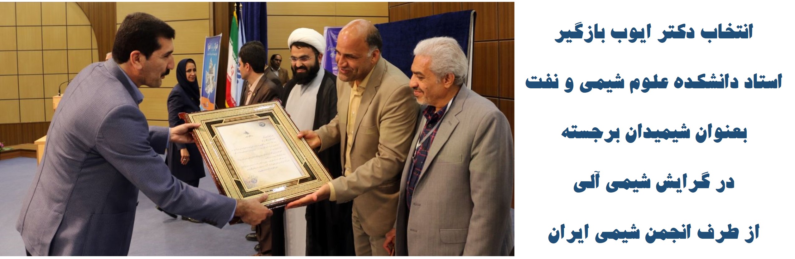 در مراسم افتتاحیه بیست و ششمین سمینار شیمی آلی ایران در دانشگاه زابل، دکتر ایوب بازگیر استاد شیمی آلی دانشکده علوم شیمی و نفت بعنوان شیمیدان برجسته کشور از طرف انجمن شیمی ایران معرفی و مورد تقدیر قرار گرفتند.